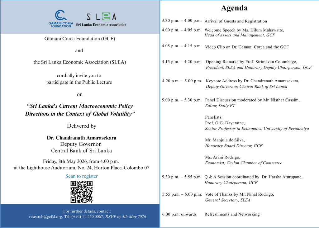 The Gamani Corea Foundation (GCF), in collaboration with the Sri Lanka Economic Association (SLEA), held the second seminar in their joint series on April 23, 2026, at the GCF headquarters. The session focused on a research study conducted under the GCF Research Awards 2024–2025 (Team Grant 02), examining the feasibility, benefits, and challenges of establishing a Special Economic Zone in Sri Lanka’s Northern Region. The research paper was co-presented by Prof. O.G. Dayaratna Banda, Senior Professor in Economics, and Dr. Malini Balamayura, Senior Lecturer in Political Science, from the University of Peradeniya. The discussion highlighted key structural and policy-related barriers to establishing an SEZ in the Northern Region, while also outlining the potential economic gains. The seminar brought together a diverse audience of academics, researchers, economists, and practitioners, facilitating a productive exchange of ideas and contributing to ongoing dialogue on strategies for inclusive and sustainable economic development in Sri Lanka.